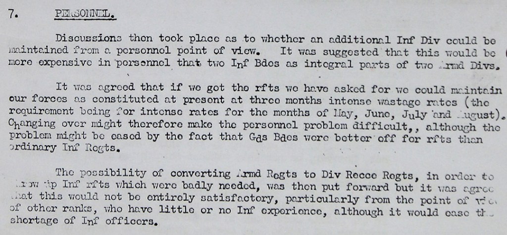 Despite this, minutes from an AFHQ (Allied Forces Headquarters) meeting held earlier on 17 January 1944 note an opinion that Guards Brigades were deemed ‘better off‘ in terms of the security of supply of reinforcements in comparison to that of ordinary Infantry regiments. With some 15 months of the war left to fight at this stage, their concern for the overall resourcing situation is palpable2: