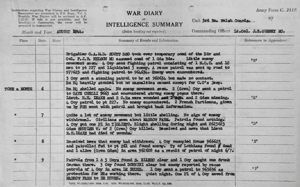 The 3rd Welsh Guards War Diary records that on 23 August 1944, at Ripalto, near Figline Valdarno, it received three officers and 98 other ranks from the Infantry Reinforcement & Training Depot (I.R.T.D.) to reinforce its numbers. As a concequence ‘2 Gren Coy’ left 3Bn Welsh Guards.