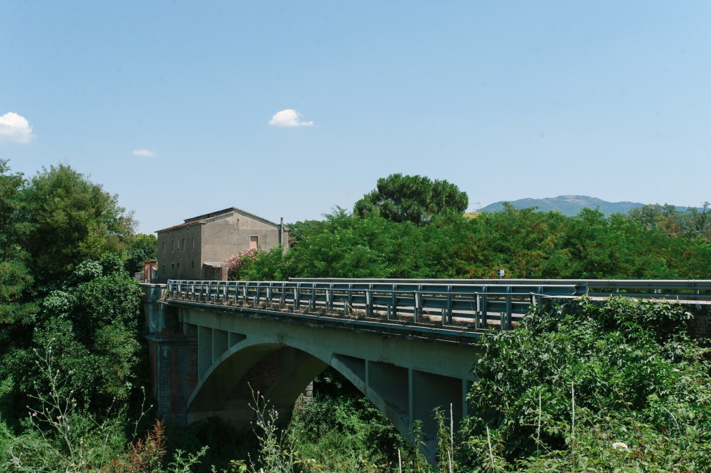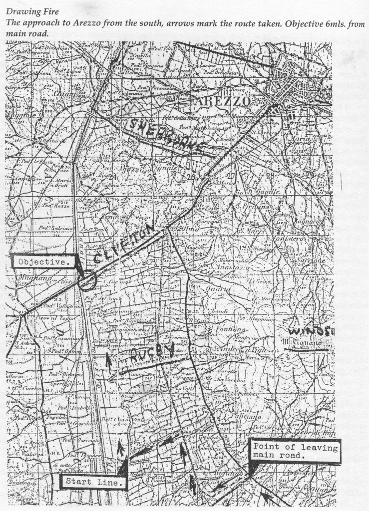 “… in the far distance I could hear the drone of the spotter plane’s engine. We approached the corner along a ditch at the roadside, at the corner we surveyed the scene. To our left the main road came to an abrupt end where the Germand had ‘blown’ a bridge over the canal, some 80 yards from our position. On the far side of the road stood a large house, part of it had been a bar or cafe, it was pock marked by shrapnel and its windows had been blow out, its shutters – some broken – hung precariously from their hinges. Debris from the bridge demolition littered the road, earth and rock littered the roadway, to our right the road, with tree shadows across it, appreared to run almost dead straigh, into Arezzo”.8