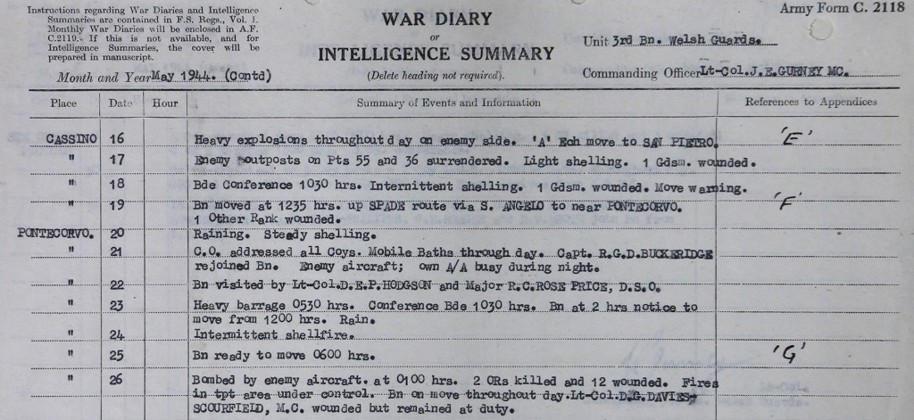 “PONTECORVO 26 (May 1944): Bombed by enemy aircraft. At 0100 hrs. 2 ORs (Other Ranks) killed and 12 wounded. Fires in tpt areas under control. Bn on move throughout day. Lt-Col D.G. DAVIES-SCOURFIELD, M.C. wounded but remained at duty.”[ii]