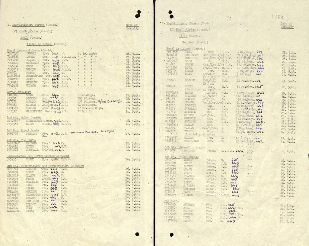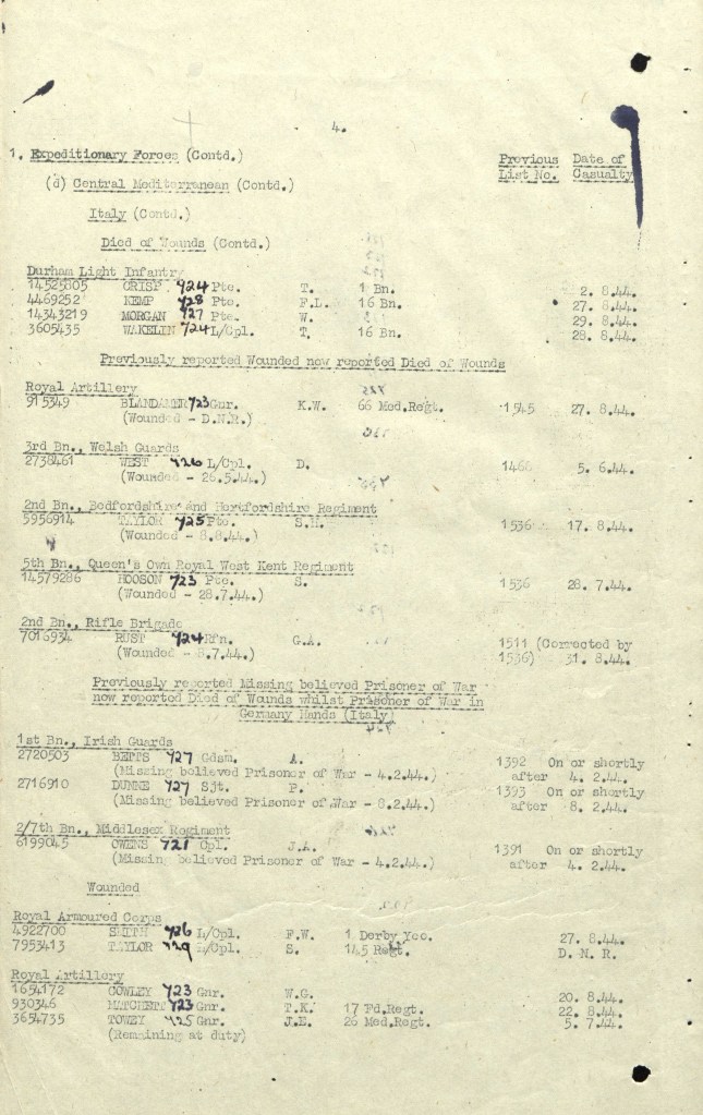 As a part of the initial compilation of the roll, I checked every page of every Casualty List from 1 January 1944 to 30 June 1945 to build up as complete a picture of possible as those who not only were killed in action, died of wounds, illness or as a result of accident, but also those who were wounded too. This was quite an undertaking to say the least as each Casualty List covers roughly a three week period and runs between 500-700 pages covering all theaters where British troops were deployed (including home).