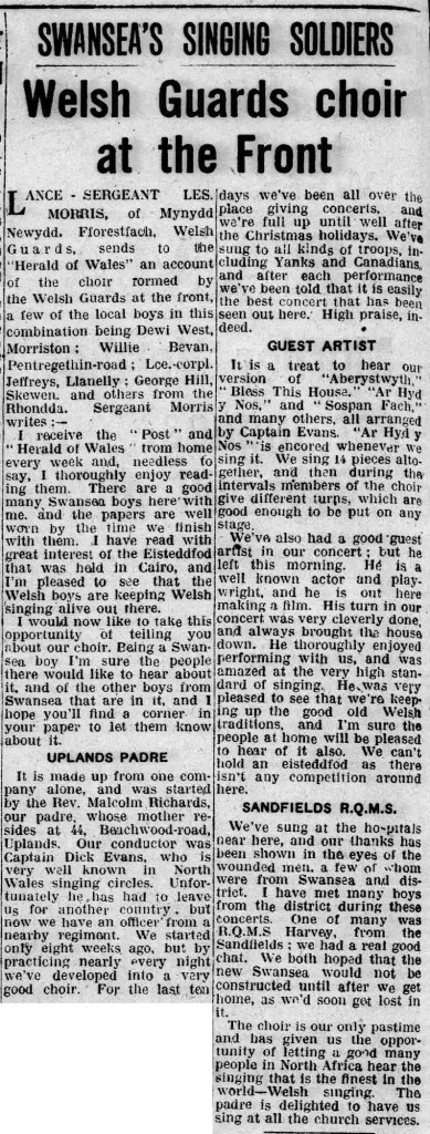 Another article about the North Africa Eisteddfod appears in the South Wales Evening Post on Monday 14 February 19442, albeit it does not mention Dewi specifically but does mention other Swansea Guardsmen: