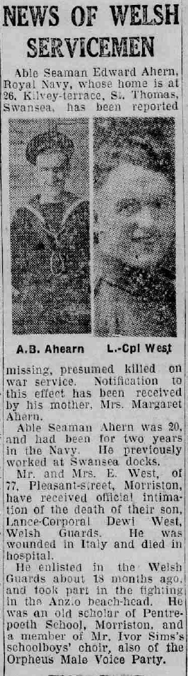 The South Wales Evening Post for Thursday, 22 June 19447, confirms his death, months ahead of it appearing in the official Casualty List. The article incorrectly states that he had taken part in the fighting at Anzio: