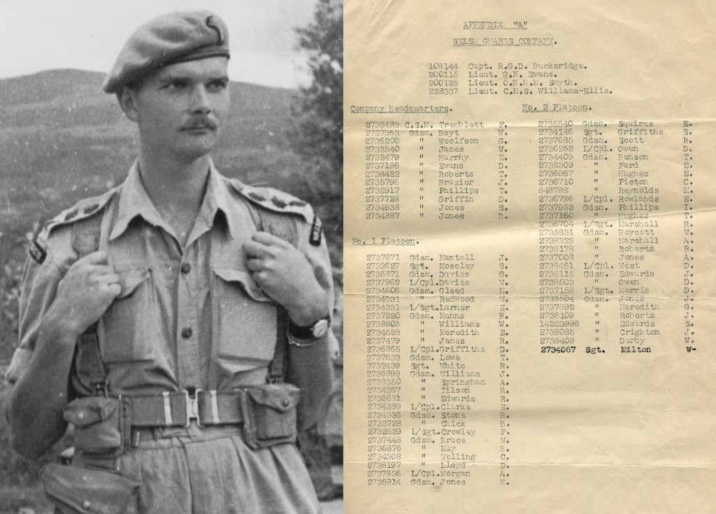 Whilst I have already written the chapter covering ‘W’ Coy for The Forgotten Fighting Third, I don’t want to let the cat out of the bag too early about their exploits. What I will say is that the unofficial War Diary kept for this period by Captain Raymond Buckeridge, Officer Commanding ‘W’ Coy, includes a complete roll for the company; Dewi is shown as being a L/Cpl in No.2 Platoon (there were 3 Platoons including self-sufficient ‘Echelons’).