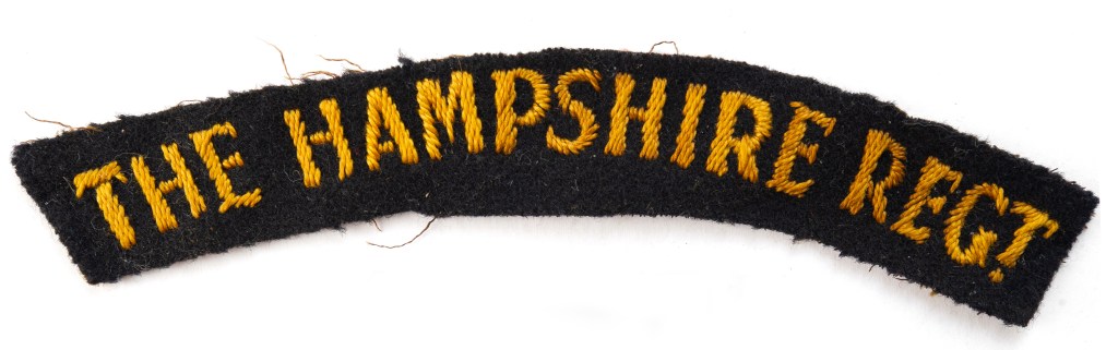 Embroidered cloth shoulder title of The Hampshire Regiment. There are several versions of shoulder titles to The Hampshire Regiments including various embroidered fonts, colourings and even calico printed versions. The exact type illustrated here feature on several surviving 2 Hampshire Service Dress tunics and Battledress blouses. There is no evidence to suggest that such a title was worn by the Welsh Guards officers at Tebourba, on the contrary they likely retained their Welsh Guards titles. © Gareth Scanlon 2025.
