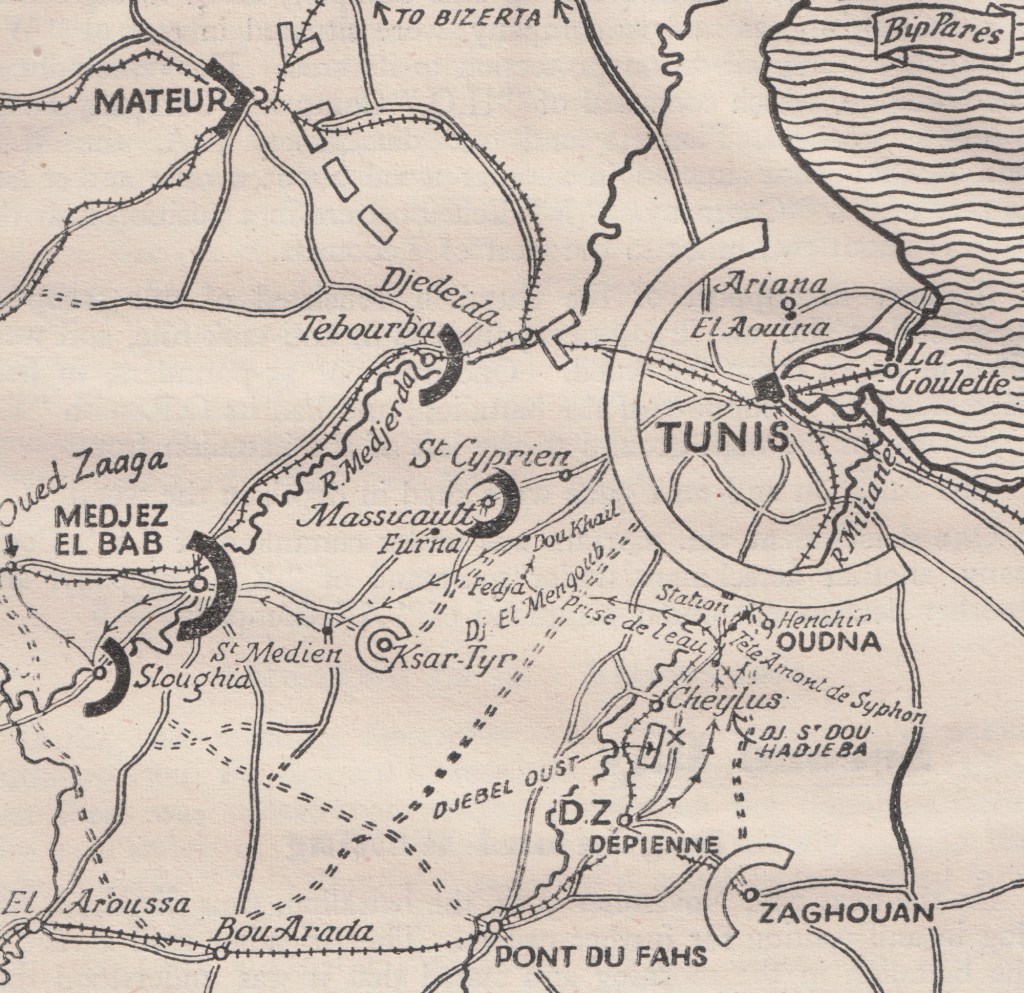 The Operation Torch landings had happened just a fortnight before the Hampshires landed in Algiers. The British forces were now some ten miles from Tunis. The plan was to probe the axis defences to find a weak point and then to force a break through for Tunis. To that end General Evelegh split his forces (that is, de-concentrate them) to achieve this.