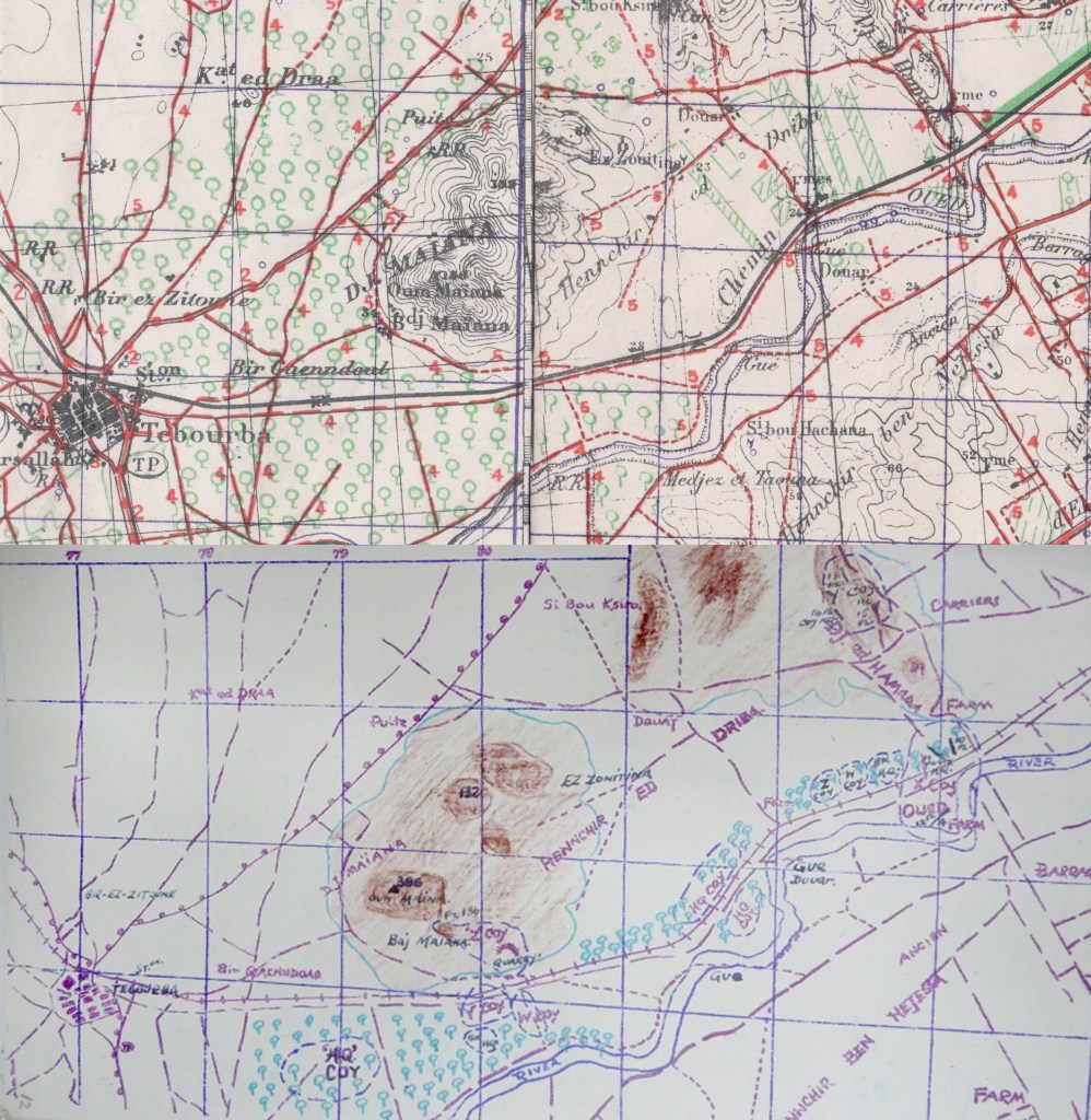 “The main Bn. position was in a grove about 25 yards wide and several miles long in the middle of a narrow valley. At the far end of the valley was Djedeida which was made invisible by a large roll in the ground. On our right flank was a continuous ridge which curved round on our left front. On this ridge there was a modern looking house and two farmhouses. Running parallel to the position on the right was a river. On our left there was another ridge which took the form of two hillocks.