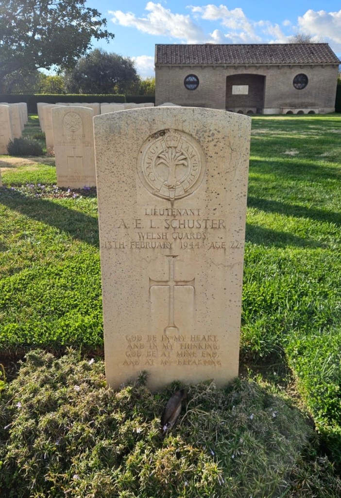 “We heard no more till February 1945, when a notice in the Press enabled us to get in touch with a corporal in the Welsh Guards who was repatriated a few days earlier from a POW camp in Germany. He told us he had been wounded and taken prioner on a patrol two nights after Anthony had disappeared. When he was brought into the enemy post which was located in a farm house, the German officer pointed to a heap of stones near the entrance and said it was the grave of an officer of the Welsh Guards, ‘Herr Schuster’, who had died of wounds in the head two days earlier.