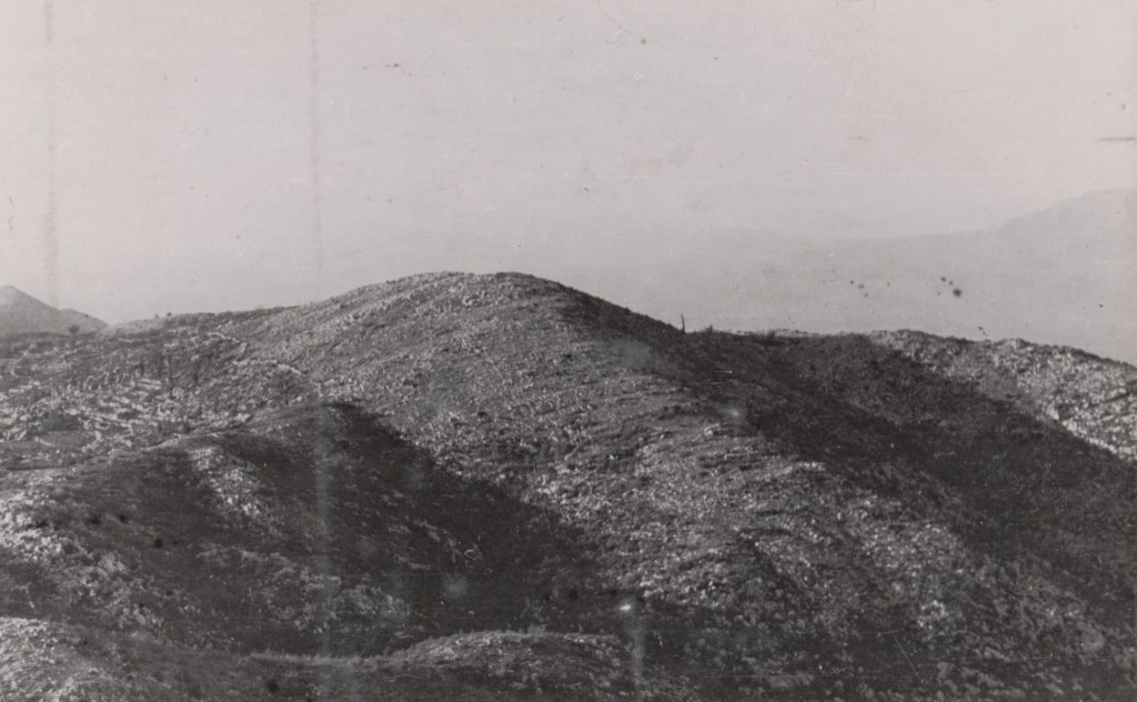 Monte Cerasola is a remote and desolate 748 metre peak. For Welsh readers: think Pen-Y-Fan in the Brecon Beacons (886 metres) altitude-wise, but it being surrounded by even larger peaks. The summit of the mountain is a mass of bare rocks, rising to crest line, 10 metres wide, bent in half circle towards the west (see the two maps and the photograph below). There and on the north side it falls steeply to the valleys which separate Cerasola from the heights of Faito and Girolfano, these being the main German held positions.