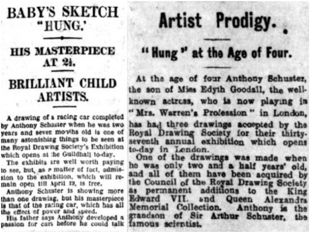 “His earliest interest in the Arts was in drawing and to a lesser extent modelling. As soon as he could hold a pencil he drew anything that interested him and he surprised us with his facility for conveying the impression of cars or animals in motion. Three of his drawings made between the ages of two and four were bought by the Royal Drawing Society, and we thought that this was where his future lay.”