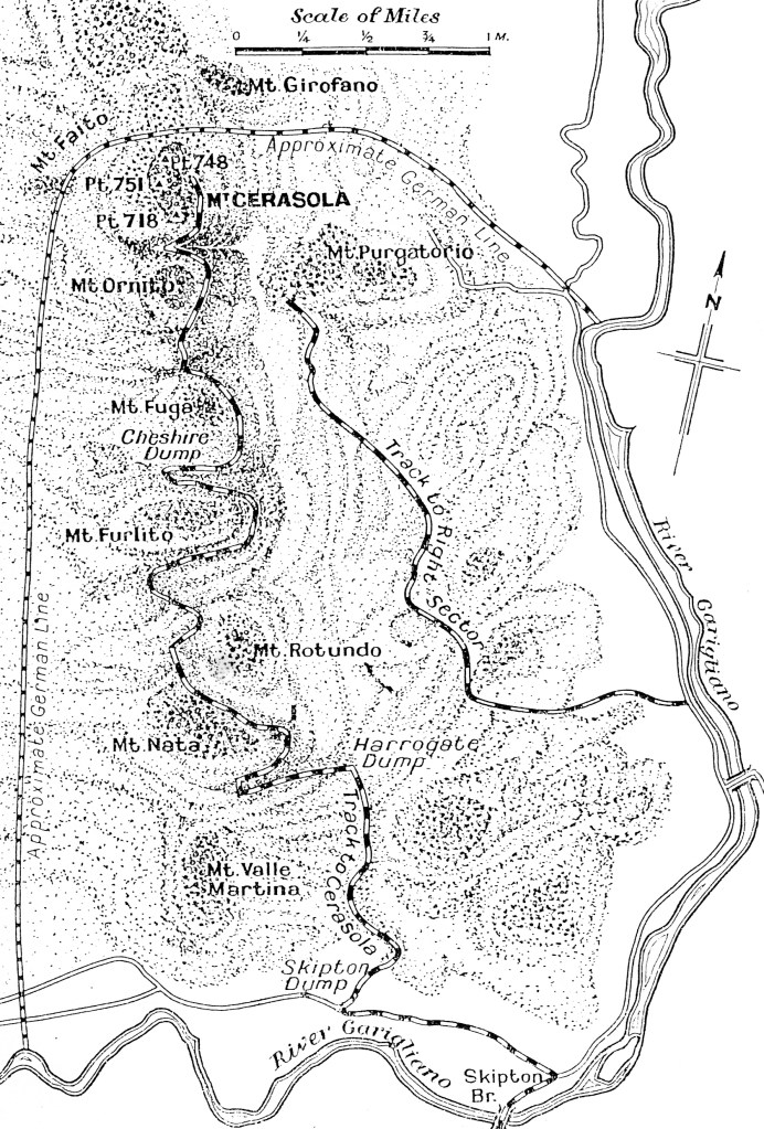 It was decided that the companies would occupy positions just below the crest line as follows; No.1 Coy at Pt.748, No.2 Coy at Pt.751 and No.3 Coy at Pt.718 (with No.4 Coy held in reserve). The Germans had outposts over the crest on the face of Cerasola which were overlooked from their main positions on Faito and Girofano.
