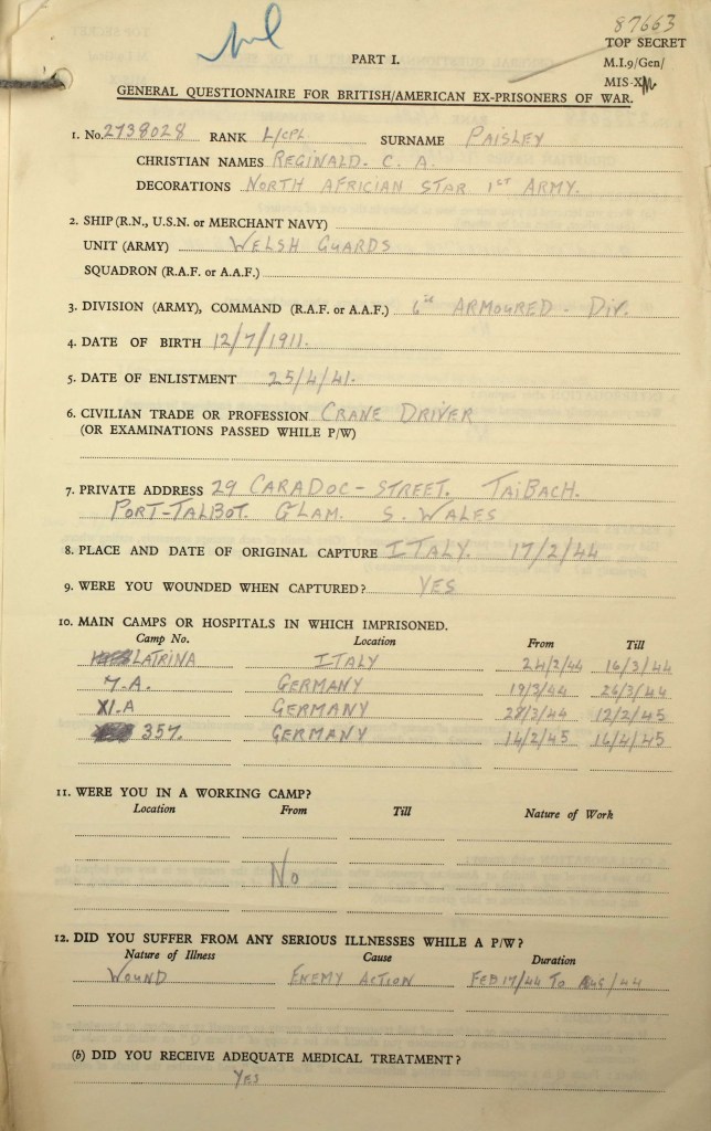Aside from Anthony, there were only two others reported as missing from the Bn’s time holding Cerasola; they were L/Cpl’s Paisley and Beynon. Paisley was not released from captivity until April 1945 (see below), therefore it was unequivocally L/Cpl Beynon that responded to the appeal.