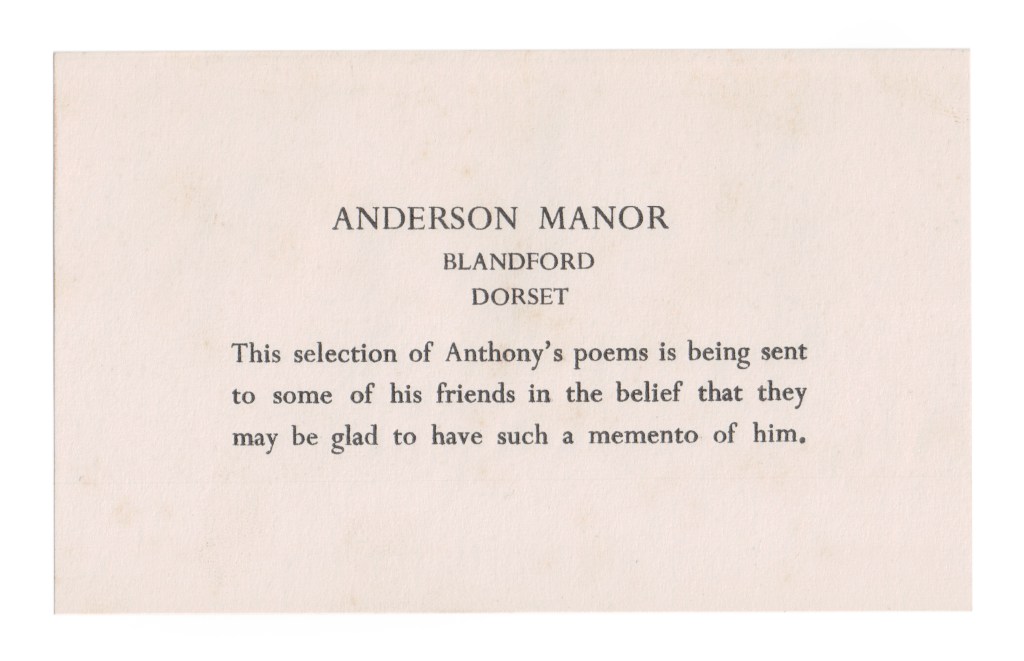 Whilst I was writing his biography, I delved a little deeper than normal wanting to know more. Through chance I became aware of a memoir book published by his father, following Anthony’s death, containing several of his son’s poems and letters. He intended it to serve as a memento of his son for others to ensure, perhaps so that he may live beyond death.